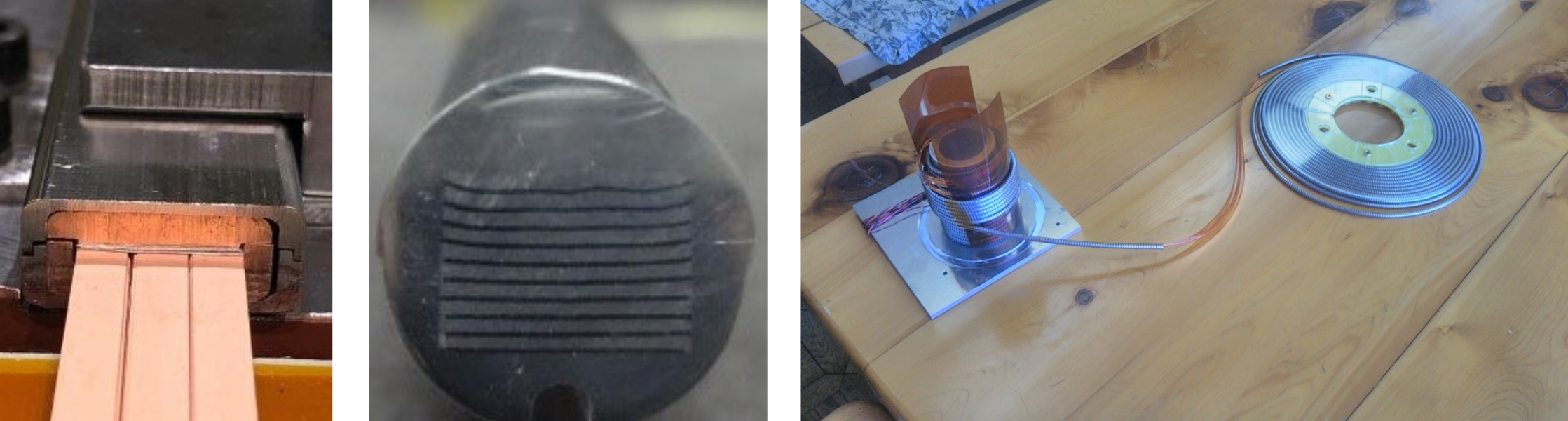 それぞれ(左)HTS-STARS導体、(中央)FAIR導体、(右)WISE導体と名付けられ、設計コンセプトは異なるが、テープ状の高温超伝導線材を積層させてヘリカル型コイル形状に巻くことを目的としている。
