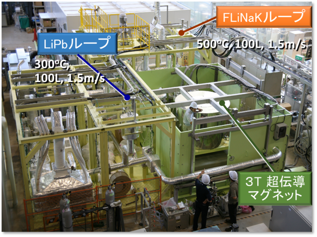 図:熱流動ループOroshhi-2の外観。液体金属(LiPb)と溶融塩(FLiNaK)の各ループからマグネット部に配管を接続して試験が可能です。腐食や伝熱実験のために簡便に交換可能なテスト用区間をそれぞれ持っています。